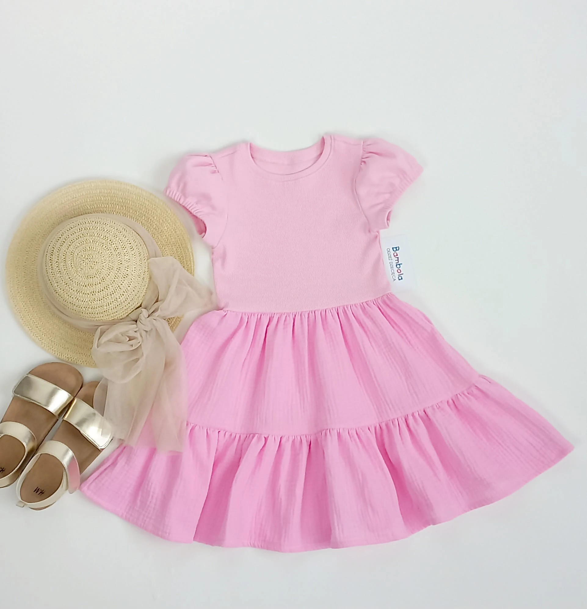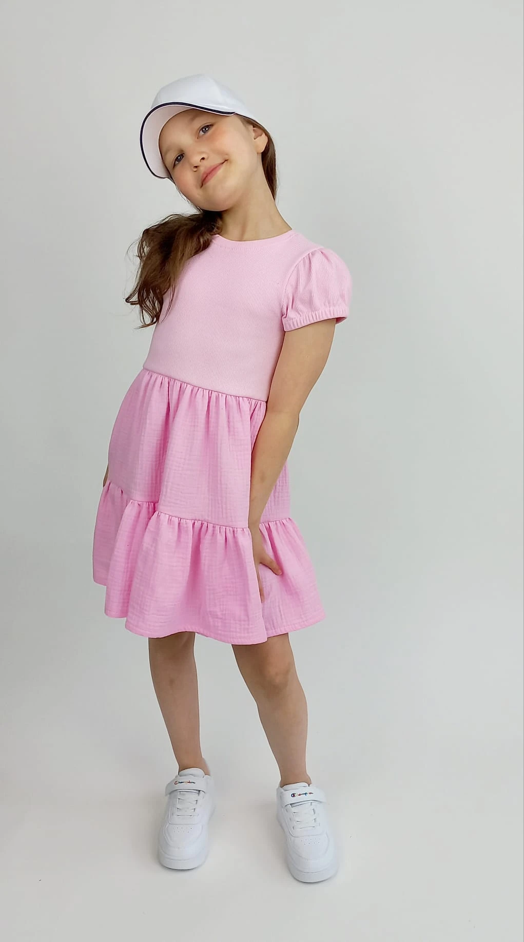 Lekka, przewiewna i niezwykle urocza – ta sukienka to doskonały wybór na ciepłe, letnie dni! Uszyta z połączenia cienkiego, prążkowanego materiału bawełnianego oraz delikatnego muślinu, zapewnia maksymalny komfort noszenia i swobodę ruchów. Krótki rękaw oraz oddychająca tkanina sprawiają, że Twoja mała księżniczka będzie czuła się w niej świetnie nawet w największe upały.